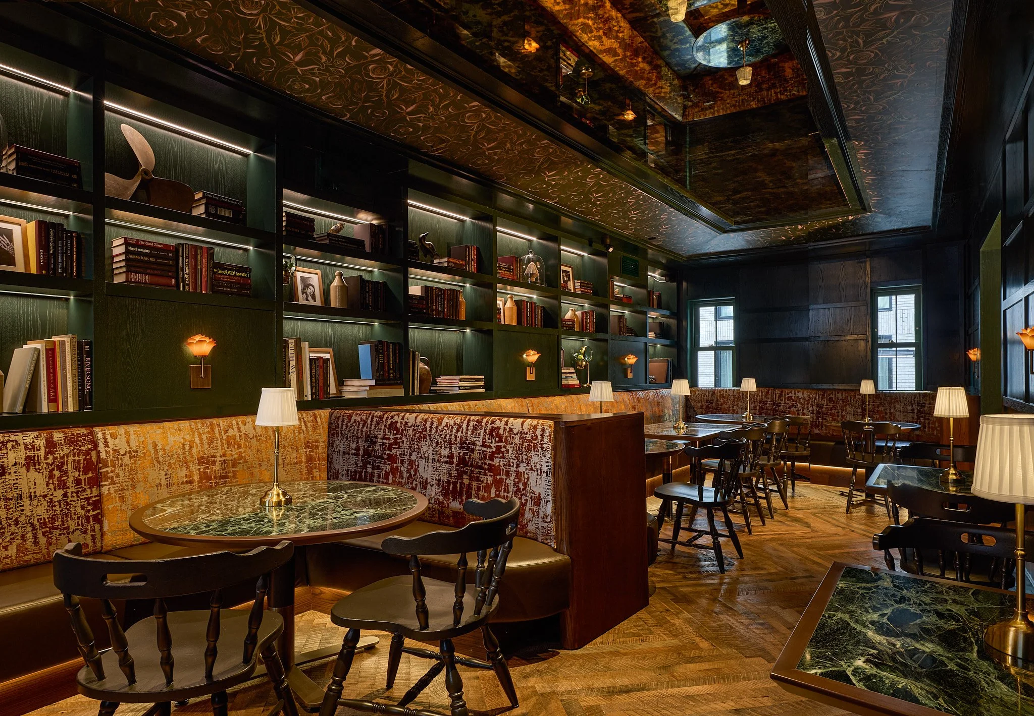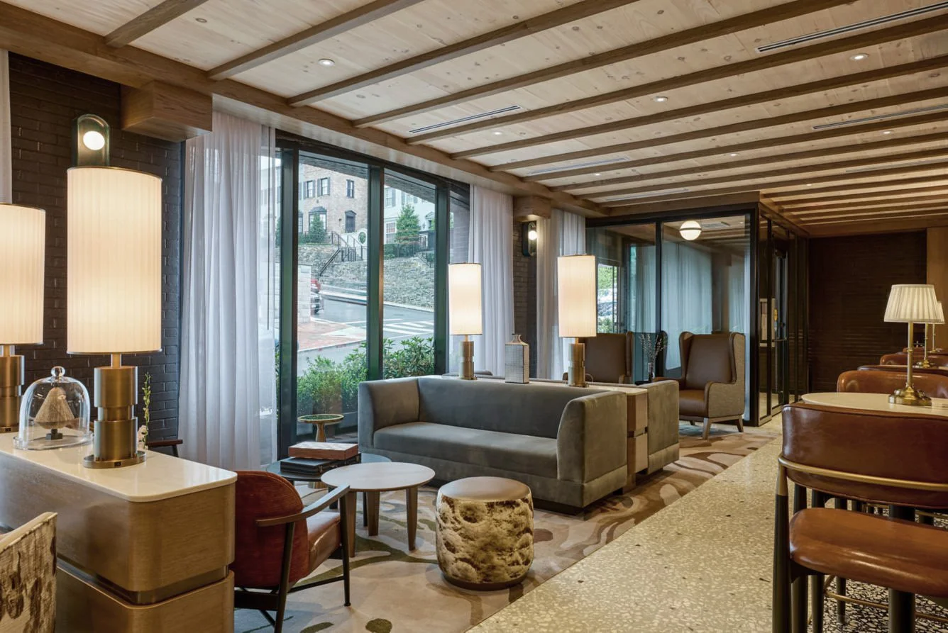 In the seating alcove, rich jewel tones and curated curiosities offer a sense of intimacy—part private library, part neighborhood salon. Natural light filters through sheer drapery, catching the texture of terrazzo flooring and the ripple of ribbed wood. Each design gesture invites you to pause: to take in the patina, the craft, the quiet luxury.