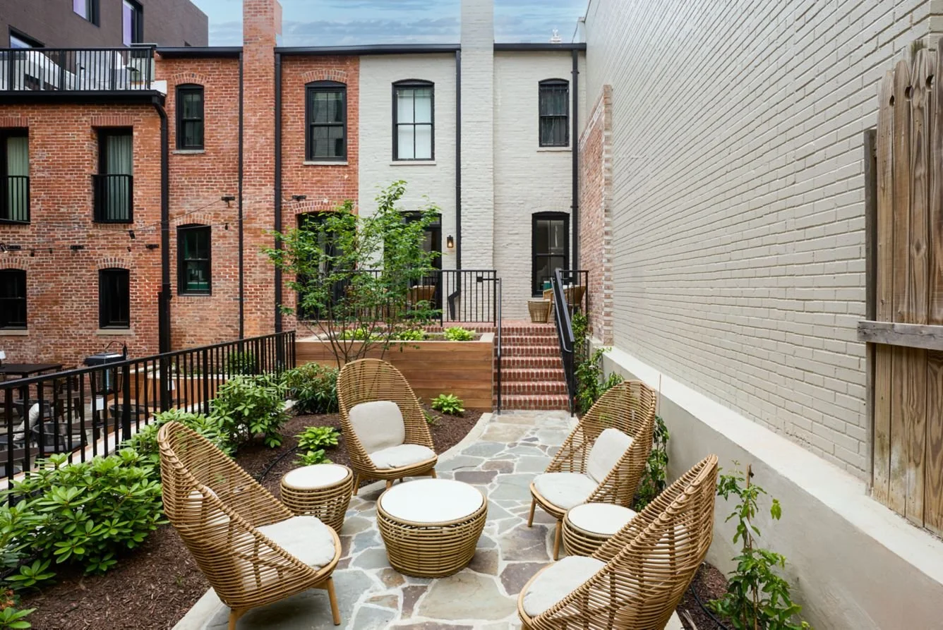 Nestled between the restored facades, the courtyard unfolds like a hidden garden—equal parts gathering place and quiet retreat. Stone pavers anchor a palette of warm wood and bronze accents, while a circular fire pit radiates a golden glow. Every table is lit by its own petite lamp, casting an intimate halo as dusk settles over Georgetown.