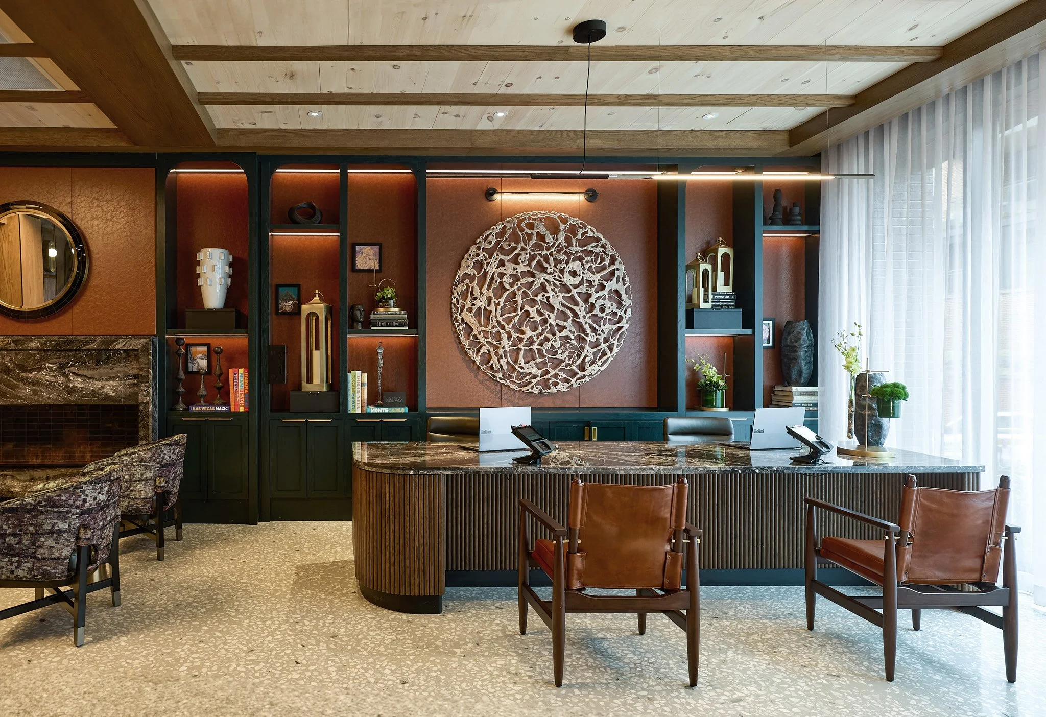 At the heart of Canal House Georgetown, the reception desk sets the tone: warm, layered, and unmistakably local. Framed by custom shelving in deep green lacquer and a curated mix of objects and art, the space balances tactile materials—leather, marble, ribbed wood—with soft light and tonal richness. A sculptural centerpiece anchors the wall, while the mix of mid-century seating and contemporary craftsmanship signals the brand’s blend of heritage and modernity. More than check-in—it’s an introduction to the story.