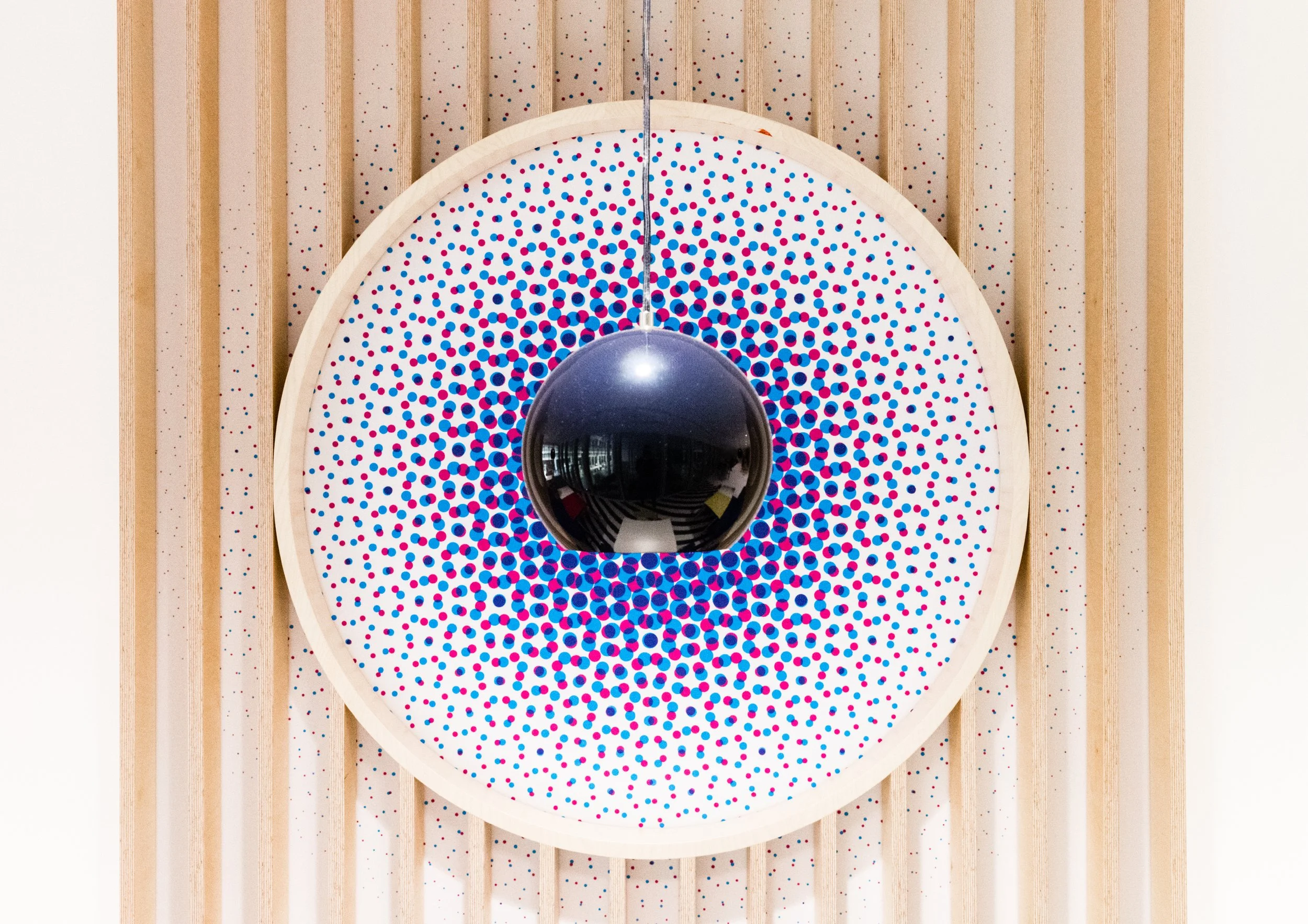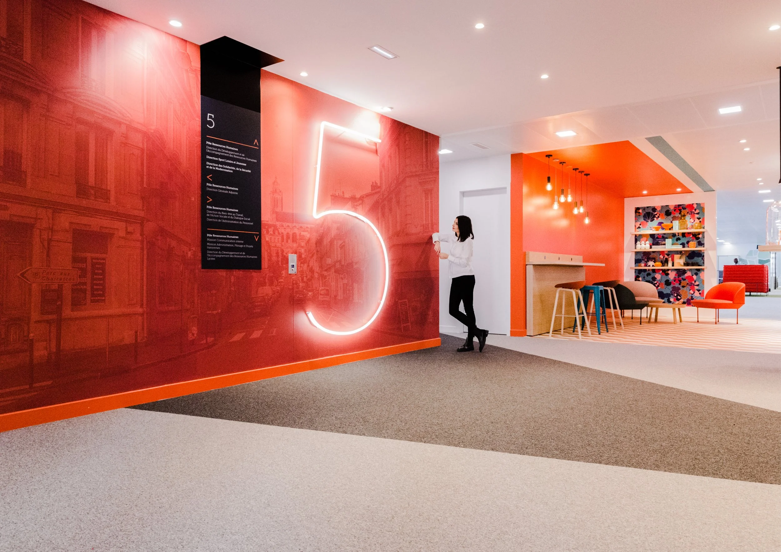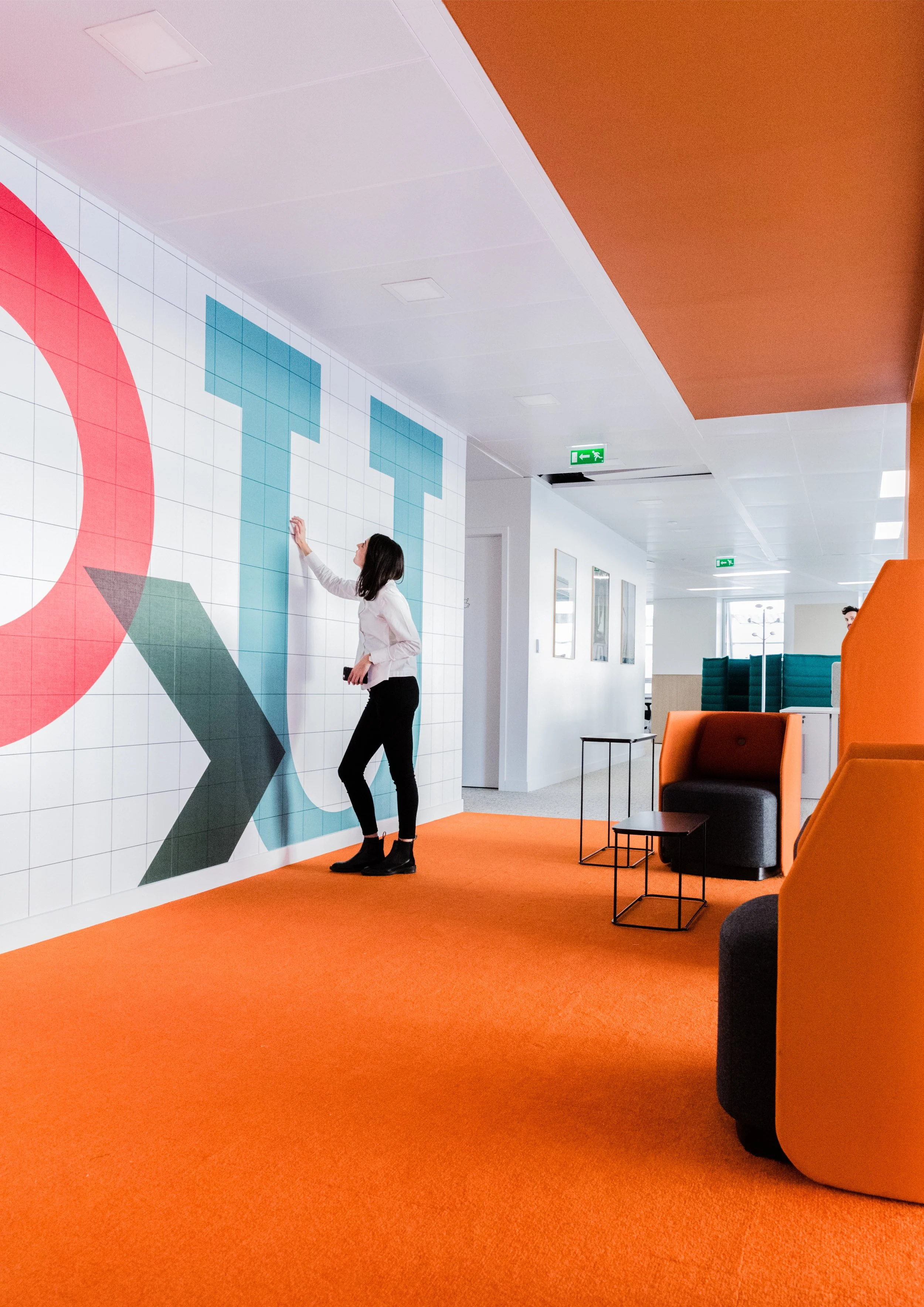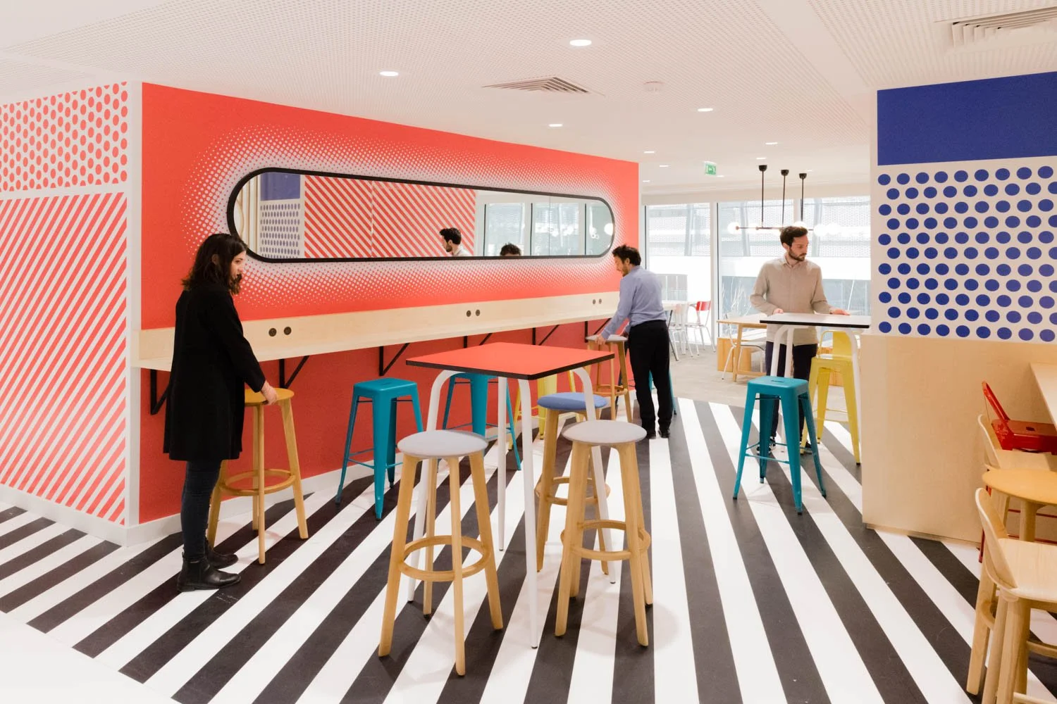 More than 50 original graphic works by Saguez cover the walls and glass partitions throughout the building, ranging from a Roy Lichtenstein-inspired pop-art style to snippets of lyrics from popular French songs and quotes from figures like Simone de Beauvoir, displayed in bold block lettering or elegant script.