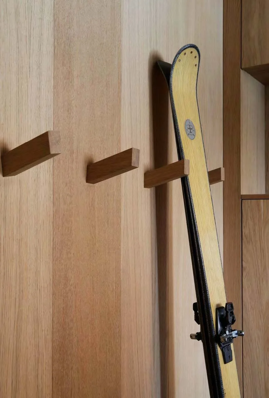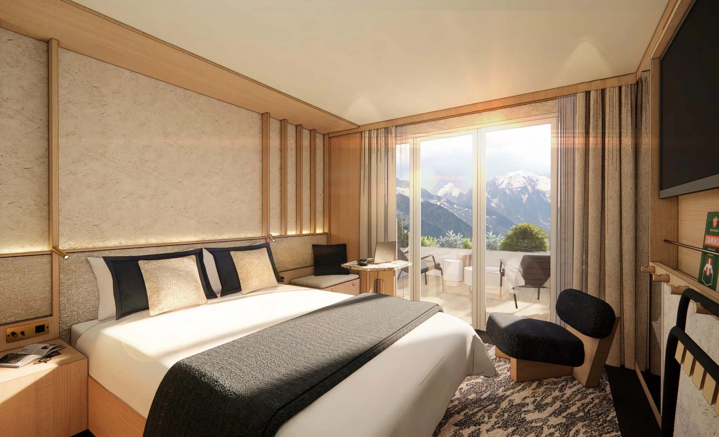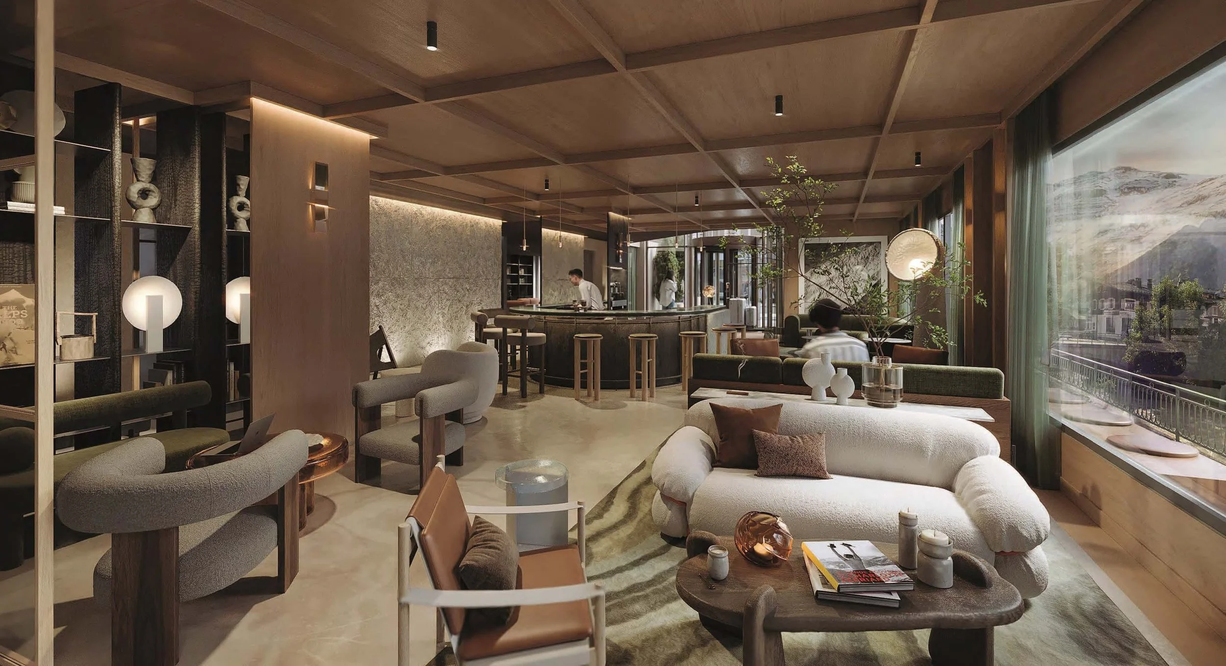 Upstairs, the guest rooms and suites are thoughtfully designed to celebrate nature. Unobstructed perspectives of the mountains enhance the surrounding natural beauty through clever mirror plays. Terraces come alive with vegetation and innovative features, fostering a connection to the environment. Inside, in deliberate contrast to the grandeur of the landscape, natural materials exude softness and warmth, meticulously tailored to every purpose. The rooms and suites are optimized as genuine mountain retreats–both snug and technologically connected