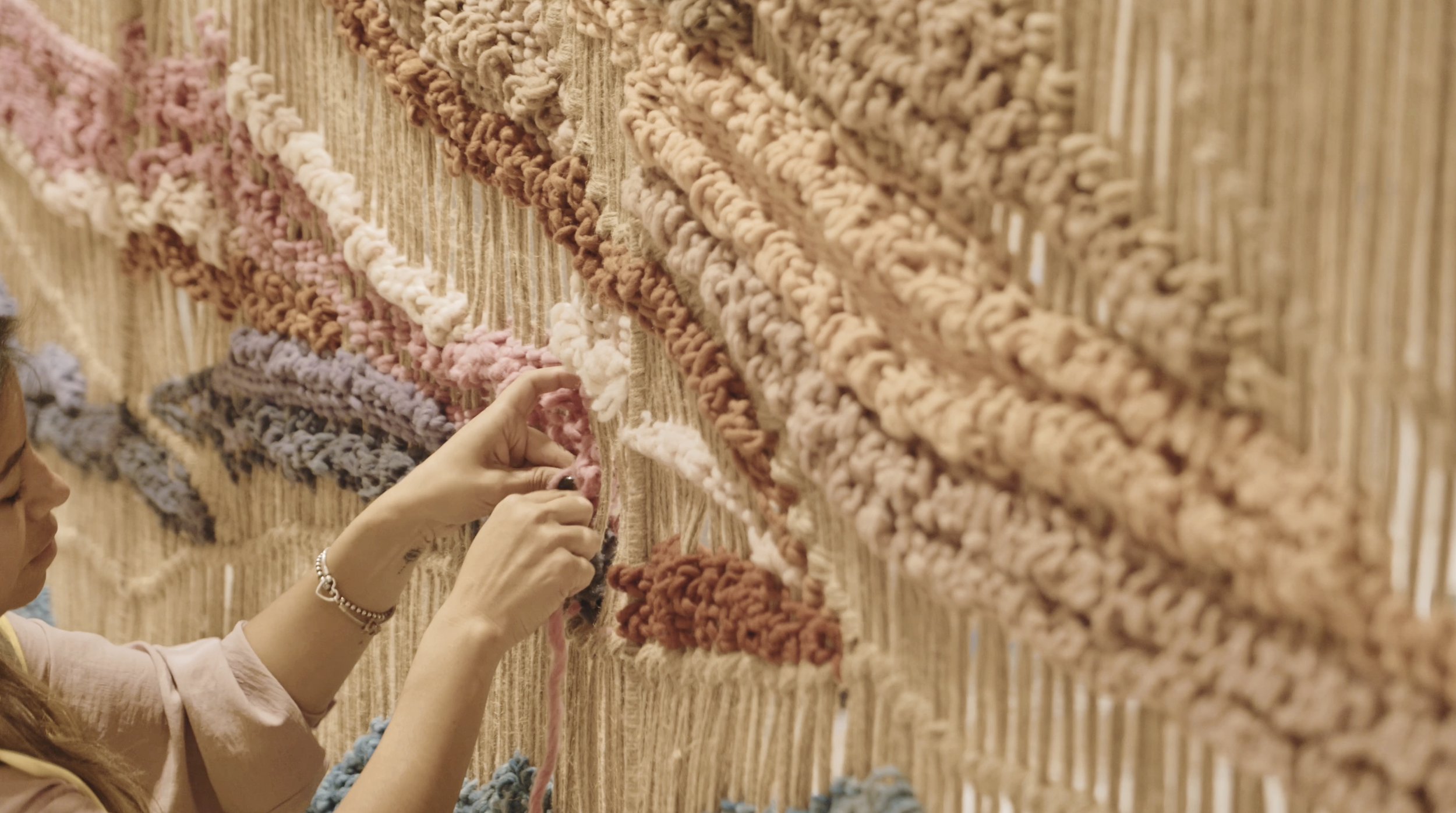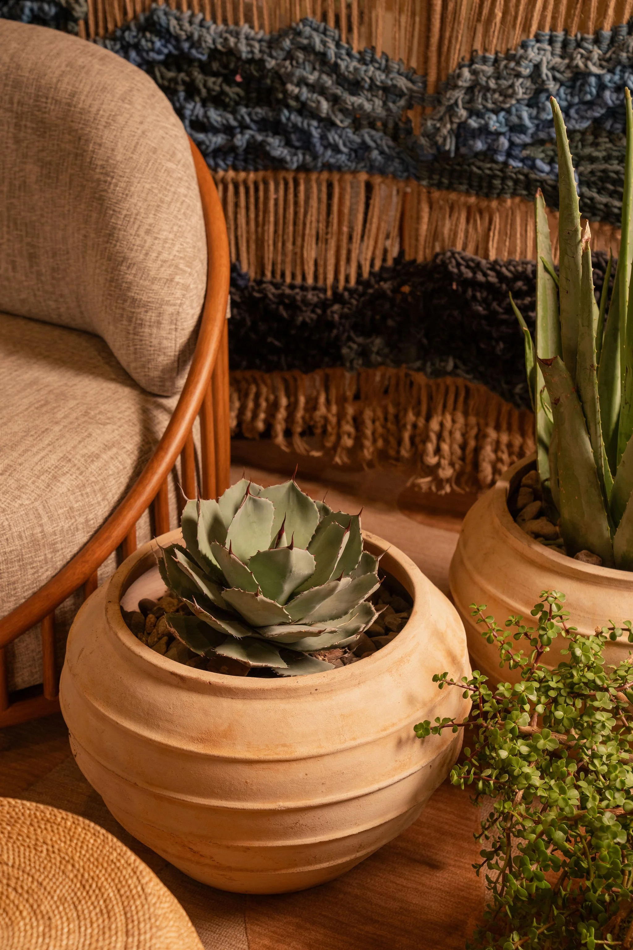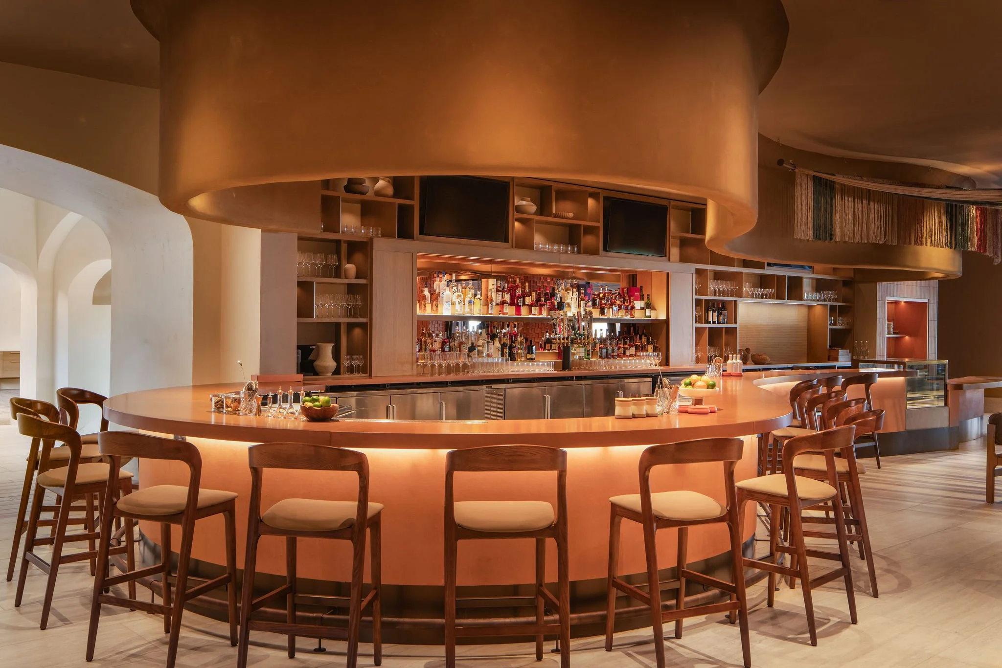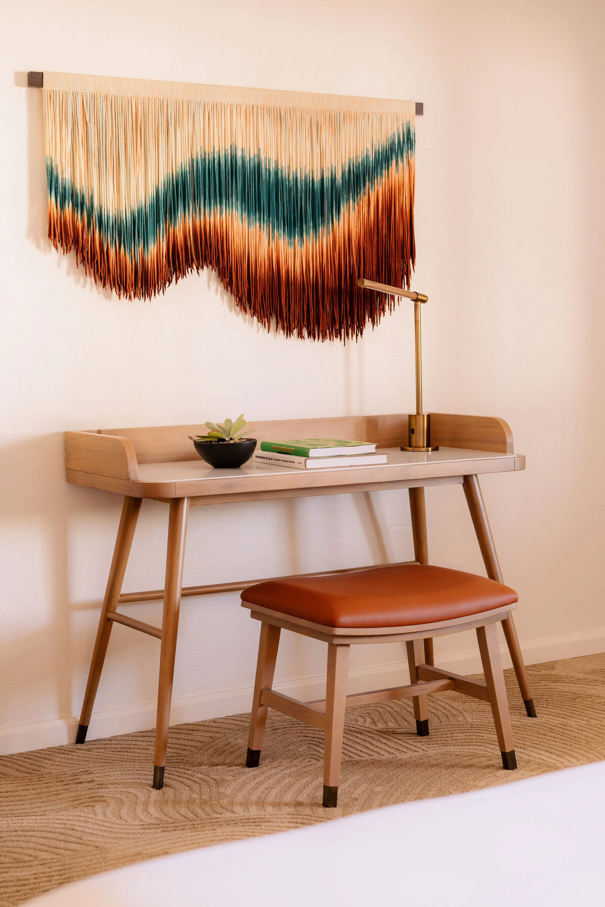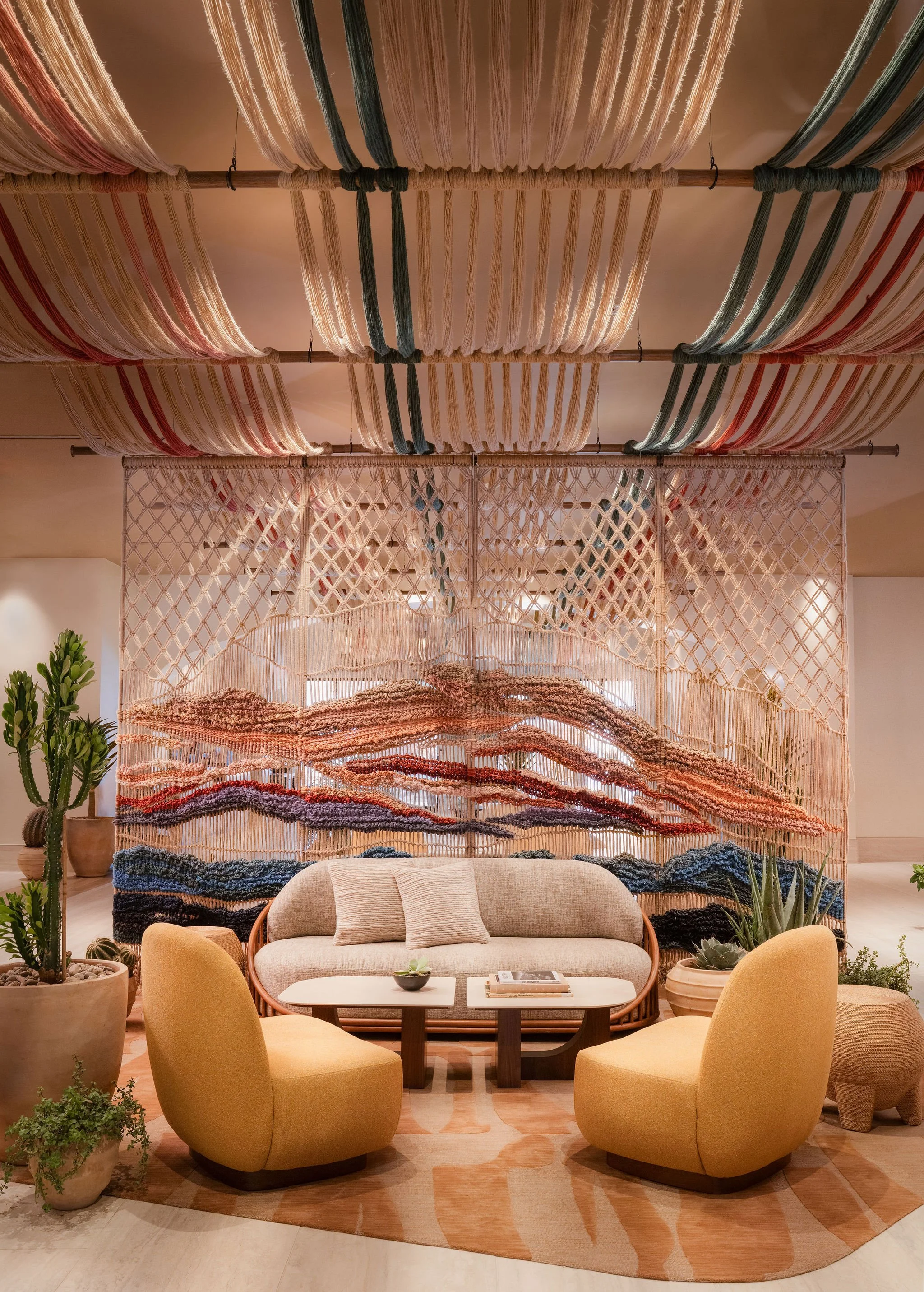 At the heart of the common areas, a monumental textile installation, The Giant Loom, highlights the artisanal dimension of the project. Designed by Saguez & Dash and created by artist Mariella Motilla for Obakki, the work runs through the lobby like a common thread. This giant loom symbolically connects the spaces and circulation routes. Its panels evoke the contours of Camelback Mountain and the lines of Mummy Mountain. Produced ethically in a village in Mexico, the installation revisits the traditional weaving techniques of native communities.
