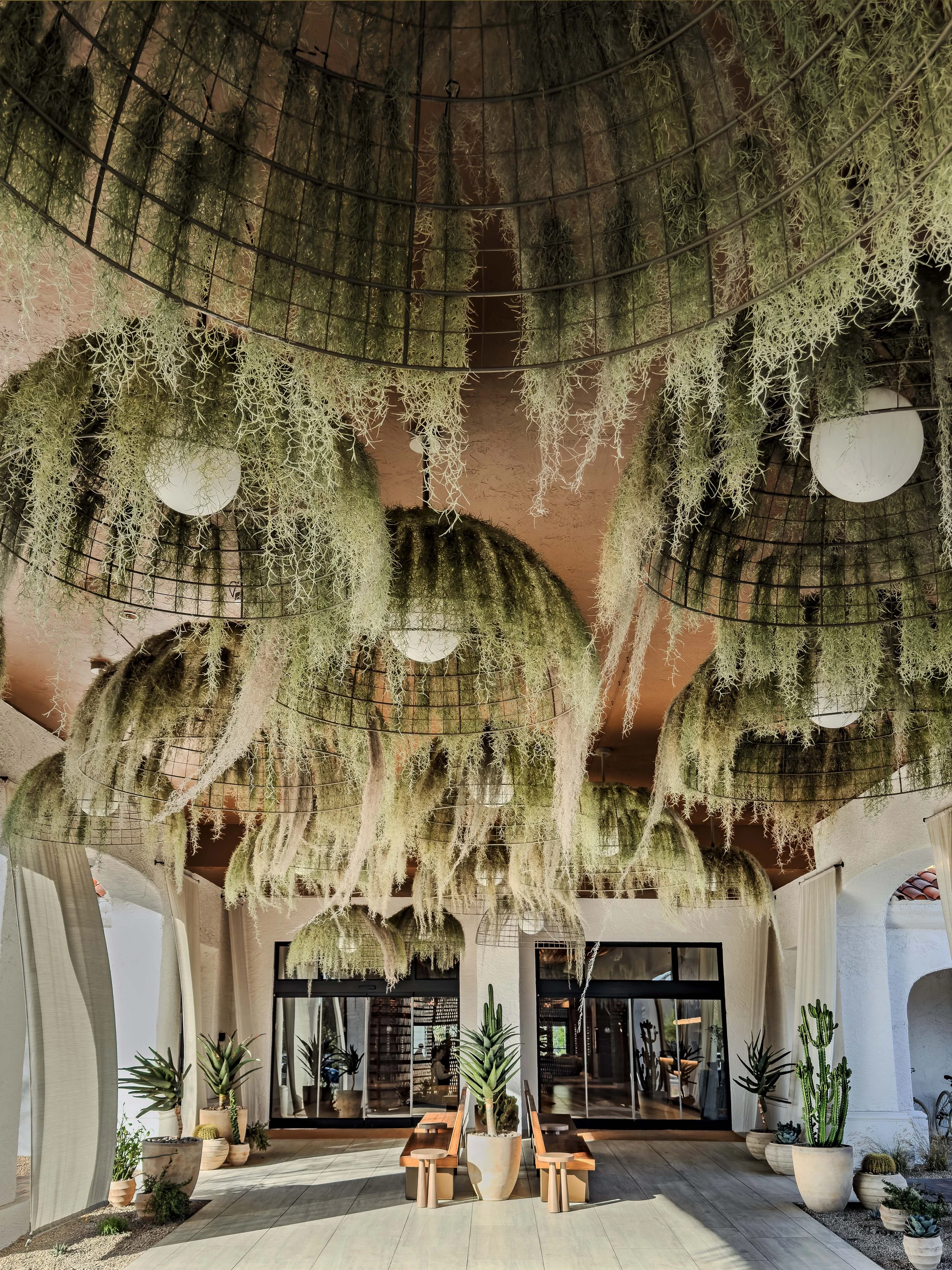 Once dark and fragmented, the lobby has been transformed into a space connecting the carriage entrance to the vast interior garden, directly in line with Mummy Mountain. Circulation is fluid; the restaurant, bar, and lounge intertwine in a natural continuity.