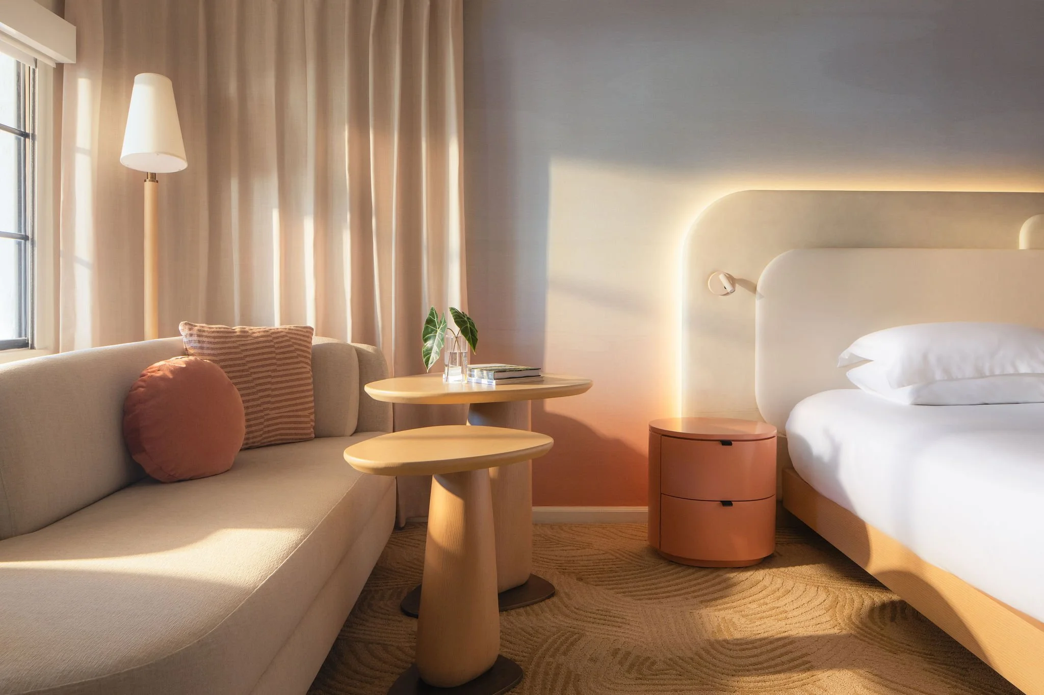 The rooms have been designed as nature-inspired retreats. The walls feature subtle shades that reflect the changing tones of the Arizona sky. Natural materials dominate: light wood, textured fabrics, mineral finishes. The soft lines of the furniture reflect the organic shapes of the landscape, transforming the room into an indoor extension of the desert. From king-size rooms to casitas with living rooms and bars, each space extends the experience of a stay immersed in the Sonoran Desert.