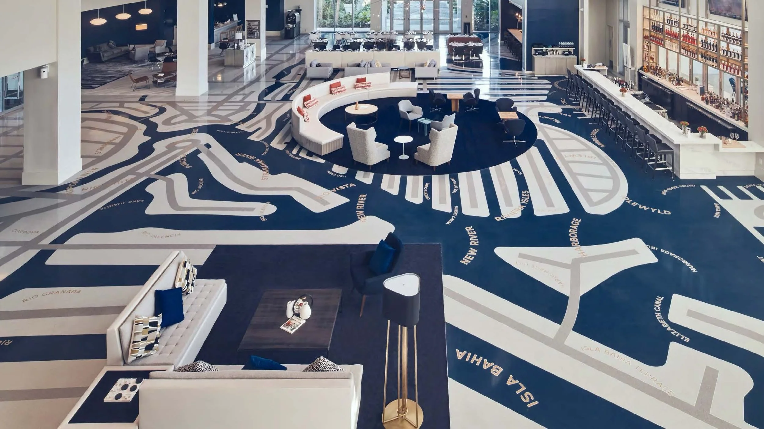 As guests enter the hotel lobby, they are welcomed by an 8,540 sqft inlaid terrazo map of the city’s street sand waterways, designed by Pentagram’s own Paula Scher