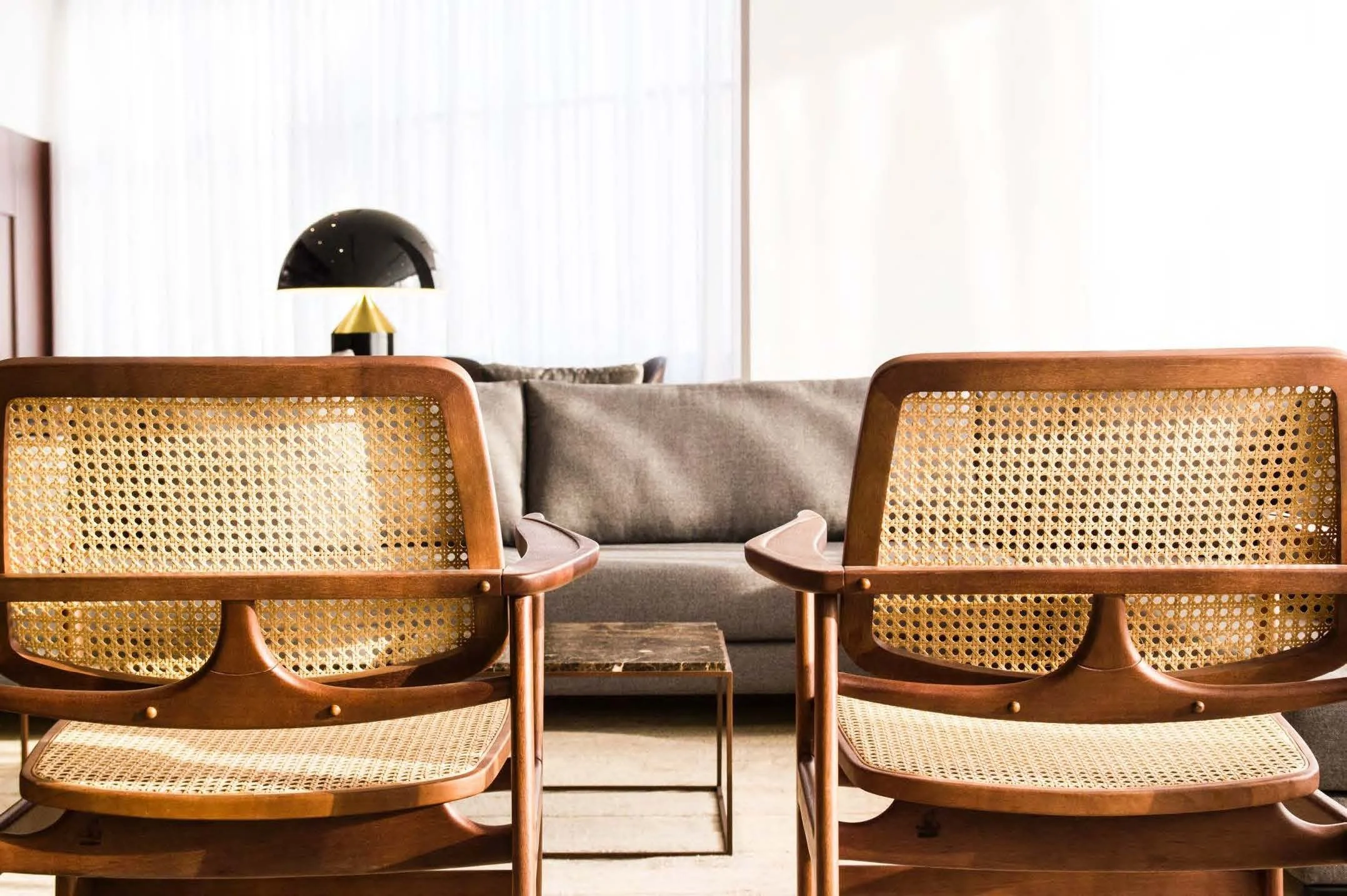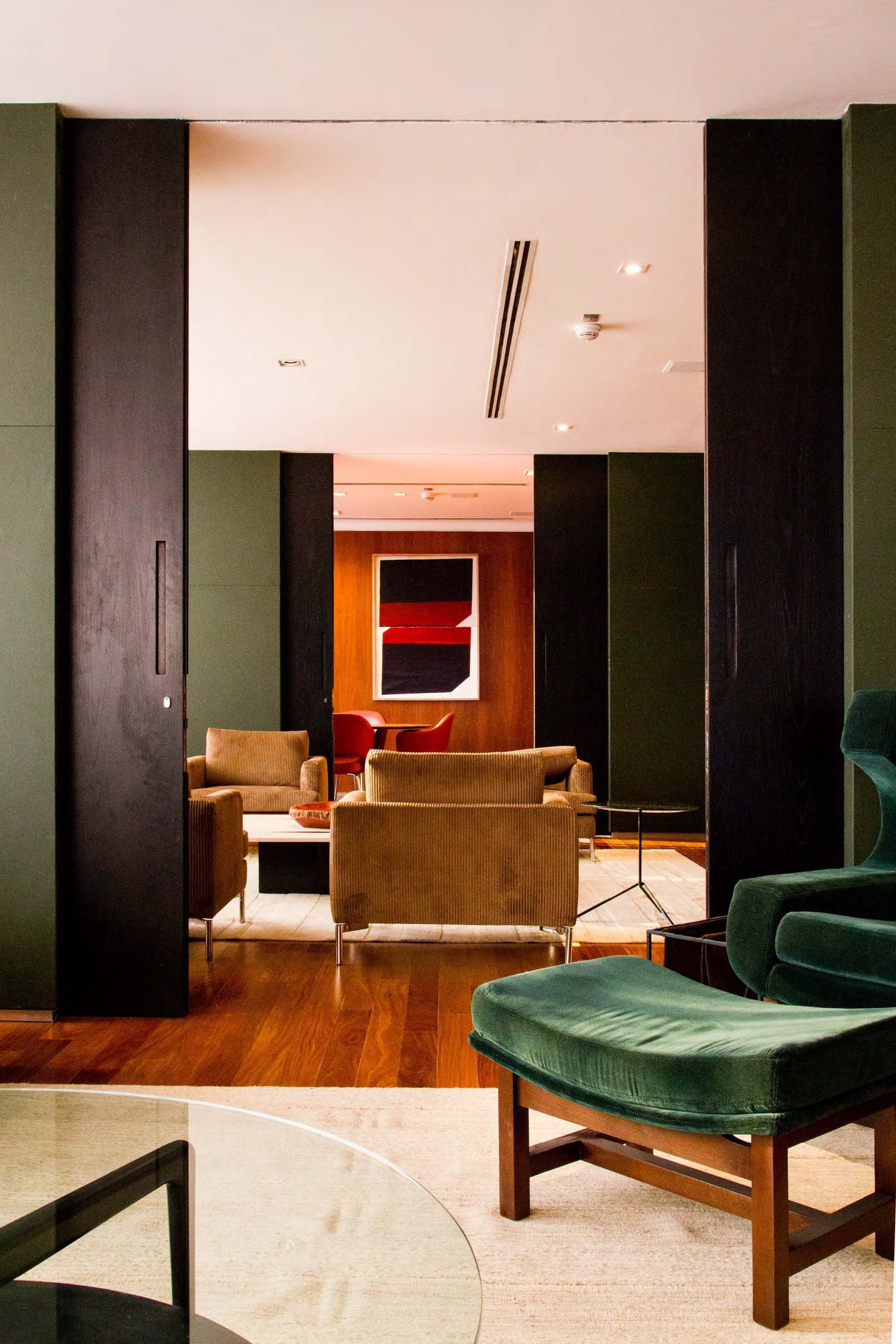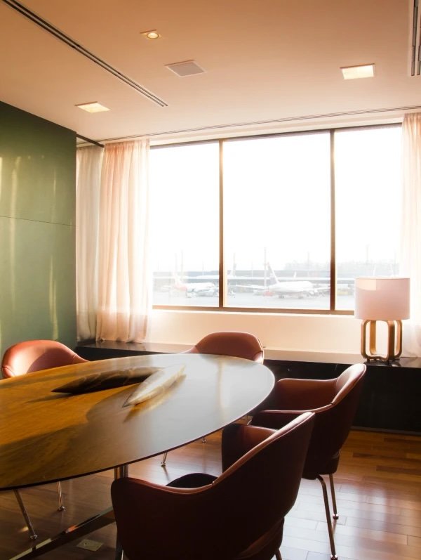 A premium lounge designed to host VIPs in a classic Brazilian villa overlooking the runways. Combining the features of a lounge, co-working space, and business center, La Villa Gru provides a wide range of high-end services: showers, coffee, kitchen facilities, business areas, private meeting spaces, and rest areas, allowing travelers to enjoy a moment of tranquility before their flights. The décor pays tribute to Brazilian designers like Sergio Rodrigues, evoking the essence of the country. The space features curved, communal areas with large partitions that can be closed to create more intimate salons.